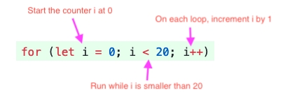 The for loop is similar to a while loop, but with a more specialized syntax. Programmers invented the for loop when they realized they were always doing the same three things: creating loop counter variables (like i above), incrementing them by some amount, and checking that they're less than a value.